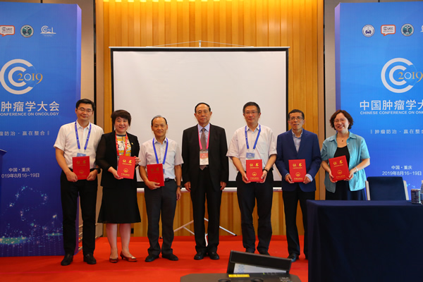 中国抗癌协会副理事长张岂凡教授为领导班子成员颁发证书并致辞。他对专委会的成立表示热烈的祝贺。