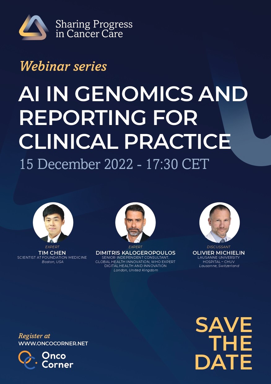由国际癌症进展学会(Sharing Progress in Cancer Care, SPCC)举办的“人工智能对于基因组学和临床实践报告的作用”在线研讨会(AI in Genomics and Reporting for Clinical Practice)将于2022年12月15日在线上开展。本次会议内容包括多媒体案例分享和圆桌讨论,特邀来自美国、英国和瑞士的三位专家学者围绕基因组学和临床实践报告与国内外同行探讨人工智能在癌症诊疗中的最佳应用。中国抗癌协会为国际癌症进展学会的战略合作伙伴,欢迎广大肿瘤专业人员积极参与在线会议。