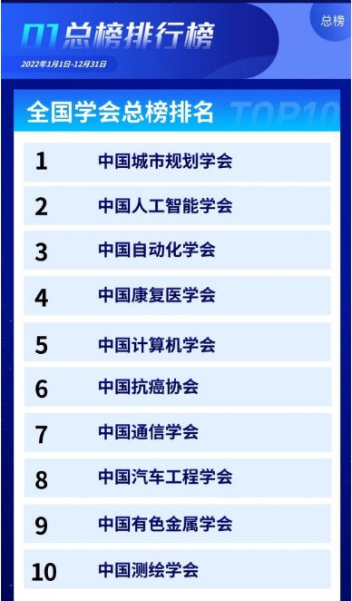 排行榜由总榜和分榜两部分构成,总榜从官方网站、官方微信、微博及其他平台三个维度开展综合评价,分榜从官方网站、官方微信、微博、今日头条、抖音5个分平台开展评价。中国抗癌协会名列全国学会年度总榜第6,其中分榜官方网站位列第4,今日头条位列第10,抖音位列第5。学会年度总榜较2021年提升了3个名次。