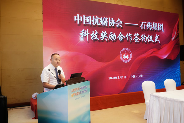 2023年8月11日,中国抗癌协会—石药集团科技奖励合作签约仪式在津举行。中国抗癌协会理事长樊代明院士、副理事长樊嘉院士、范先群院士、陆伟教授、徐瑞华教授、朴浩哲教授、吴永忠教授、王瑛教授、张建功教授、程向东教授、李子禹教授、赵勇秘书长,石药集团抗肿瘤药事业部副总裁李建强、高级总监冯晓梅女士等出席会议。王瑛副理事长主持了签约仪式。