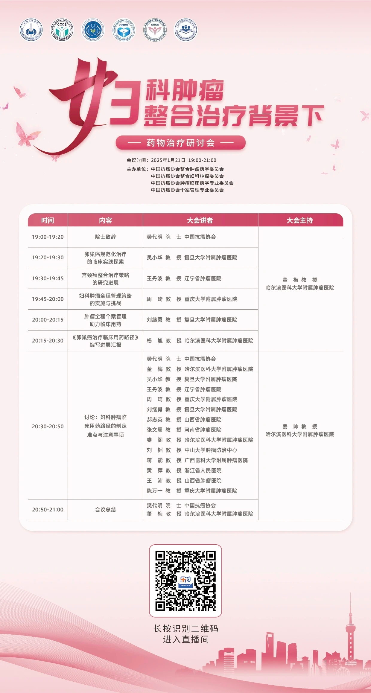 为推动建设全面且完善的妇瘤临床用药路径,进一步提升中国妇瘤临床诊疗与用药安全水平,由中国抗癌协会指导,中国抗癌协会整合肿瘤药学委员会、中国抗癌协会整合妇科肿瘤委员会、中国抗癌协会肿瘤临床药学专业委员会、中国抗癌协会个案管理专业委员会主办的“整合创新,共绘药径”:整合治疗背景下妇瘤药物治疗研讨会,将于2025年1月21日(周二)19:00-21:00在腾讯会议平台线上召开。
