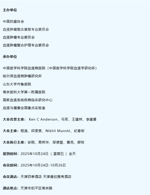 此次会议由中国抗癌协会血液肿瘤整合康复专业委员会、血液肿瘤专业委员会、血液肿瘤整合护理专业委员会联合主办,中国医学科学院血液病医院(中国医学科学院血液学研究所)、哈尔滨血液病肿瘤研究所、山东大学齐鲁医院、南京医科大学第一附属医院、国家血液系统疾病临床研究中心、血液与健康全国重点实验室共同承办。