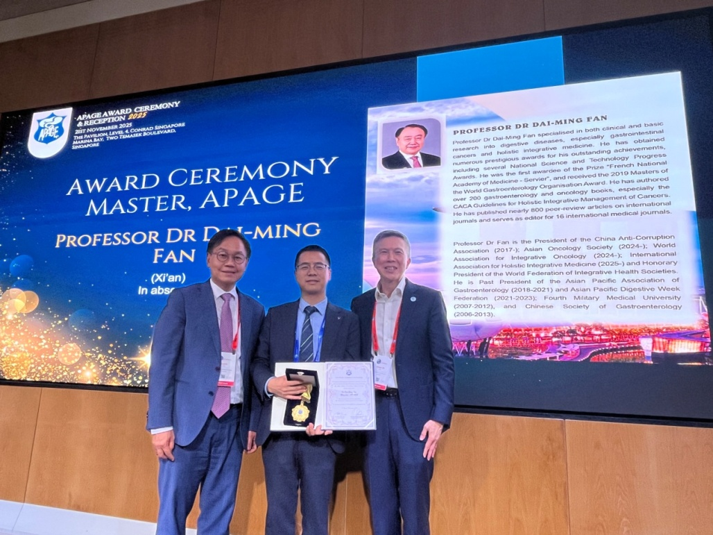 11月21日,在新加坡召开的2025年亚太消化疾病周大会(APDW 2025)上传来喜讯,中国抗癌协会(CACA)理事长樊代明院士被亚太消化病学会(APAGE)授予“亚太消化病学大师奖(Master of APAGE)”,旨在表彰他在消化病学领域做出的里程碑式杰出贡献和全球性领导力。樊院士因特殊原因无法亲赴现场参会,特委托中华医学会消化病学分会的专家代为领奖。