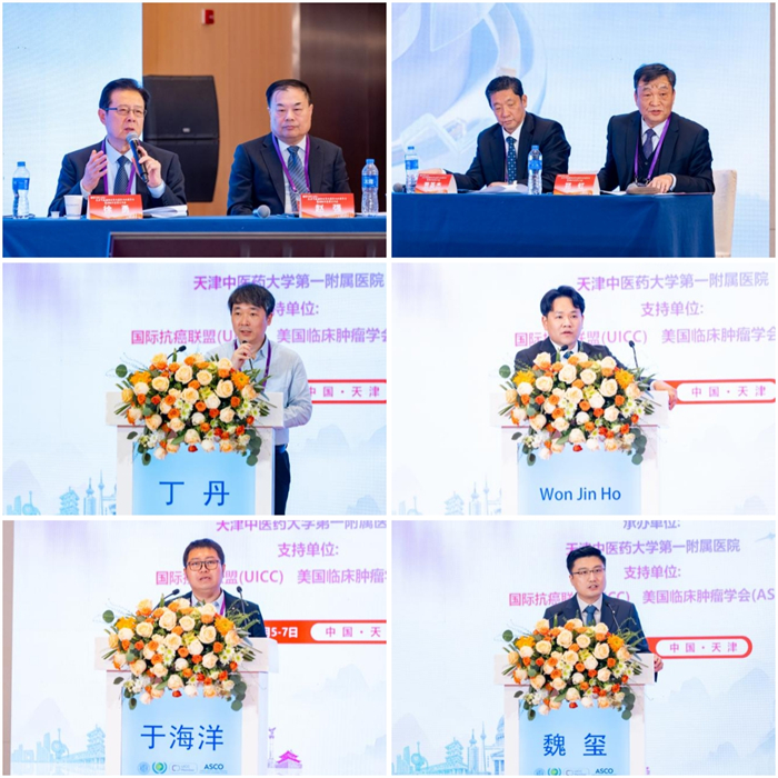 主旨报告环节,国内外专家轮番带来前沿观点与实践成果,覆盖基础研究、临床应用、技术创新等多个维度:中山大学肿瘤防治中心马骏院士以“以临床问题为导向开展科技创新”为题,结合自身研究实践,强调肿瘤科研需紧扣临床需求,通过典型案例阐述“从临床到科研再到临床”的完整实践路径,引发对“临床与科研协同发展”的深度思考;ASCO副主席Christopher R. Merlan教授聚焦 “AI in Oncology-from Promise to Practice”,系统解读人工智能在肿瘤早筛、精准诊断、治疗方案优化等环节的应用现状与瓶颈,分享ASCO推动AI与肿瘤临床融合的实践经验;南开大学丁丹教授从材料科学与医学交叉视角,介绍新型光学材料在肿瘤成像、靶向治疗中的创新应用,其团队研发的可降解光学造影剂已在动物实验中实现肿瘤精准定位与实时监测,为肿瘤微创治疗提供新工具;约翰?霍普金斯大学西德尼?金梅尔综合癌症中心 Won Jin Ho教授,深入解析肿瘤微环境对免疫治疗的影响机制,提出通过调控免疫抑制因子提升疗效的思路,并分享团队在免疫联合治疗领域的最新研究成果;天津中医药大学于海洋教授立足本土传统医学,作“清热解毒中药抗肿瘤作用研究”报告,通过现代药理学研究证实相关中药成分的抗肿瘤机制,构建“中药复方 —靶点—通路”研究体系,为中西医协同防治肿瘤提供科学依据;天津医科大学肿瘤医院魏玺教授围绕“肿瘤超声诊疗一体化临床基础与转化”展开分享,介绍团队研发的新型超声造影剂与微创治疗技术,该技术已应用于肝癌、乳腺癌等疾病精准诊疗,实现“诊断—治疗— 疗效评估”一体化,彰显天津本土肿瘤诊疗技术创新实力。副理事长徐勇教授、赵强教授、郑虹教授及贾英杰教授共同主持本次学术环节,并针对相关内容作专业点评。