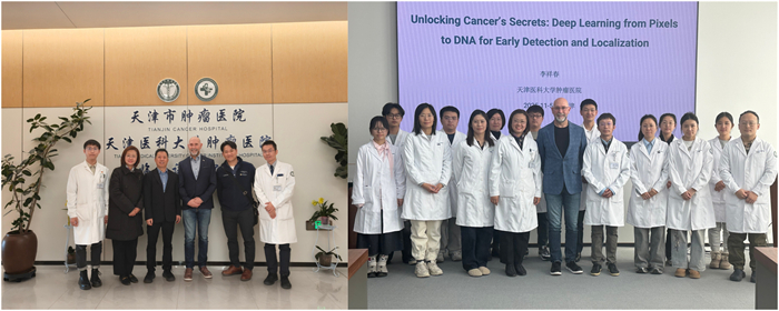 本次系列活动期间,外国专家还走进天津医科大学肿瘤医院,开展实地交流与合作探讨。其中,约翰?霍普金斯大学西德尼?金梅尔综合癌症中心的Won Jin Ho教授参观了医院临床试验中心、胰腺肿瘤中心,并与余俊教授、王秀超教授等胰腺科专家围绕临床诊疗难点、科研合作方向进行深入学术交流;ASCO副主席Christopher R. Merlan教授则与天津医科大学肿瘤医院肿瘤人工智能与大数据中心主任李祥春教授,就AI辅助肿瘤治疗的技术应用、数据安全等话题展开专项研讨,并在转化研究部王茜老师陪同下参观医院科技转化展厅,进一步了解天津在肿瘤科技成果转化领域的实践与探索,为后续深化国际合作奠定基础。天津市抗癌协会对外联络部部长徐婷婷陪同参观。