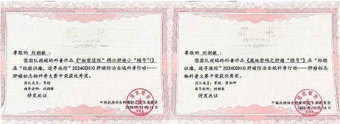 2024年11月16日,在成都医学院第一附属医院肿瘤科团队老师的指导下,CACA学生部推送了23级临床本科卓师班常超及蒲相坤两位同学的科普作品《“秘密侦探”揭示肿瘤小“暗号”》及《藏地密码之肿瘤“暗号”》参加2024CCHIO肿瘤防治全域科普行动-肿瘤标志物科普大赛,在大会中分别获得两个优秀奖。