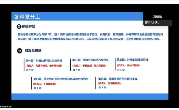 会议明确,各篇章负责人紧扣研究深度与论述精度打磨内容,加强篇章间沟通衔接,确保全书知识体系的连贯与统一。针对何伟玲教授提出编写过程中可能出现的内容交叉、重复等核心问题,聂勇战教授给出系统性解决方案,提出 “各章节提纲先行共享、篇章负责人统筹梳理、跨章节团队提前沟通”。此外,会议还明确了编写工作遵循中国抗癌协会编写统一格式,敲定开展章节间互换互审等具体时间节点。