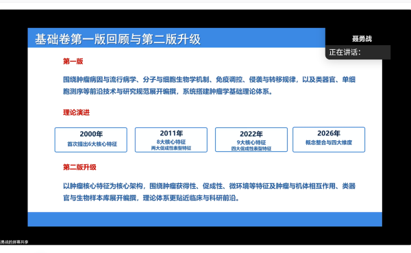 作为《整合肿瘤学》丛书21个分卷的重要基石,《整合基础肿瘤学》立足肿瘤学基础研究前沿,旨在重构系统、前沿、贴合临床的肿瘤学基础理论体系,填补国内该领域系统性专著的空白。聂勇战教授在会议中明确了全书的核心编写导向,提出第二版基础卷以2026年《Cell》发表的肿瘤核心特征最新综述为理论蓝本,深度融合整合医学思维,确立了肿瘤获得性功能特征、促成性表型特征、微环境特征、癌症与机体全身性相互作用四大核心维度的编写框架,同时增设肿瘤类器官与生物样本库前沿技术板块,形成 “理论机制 - 微环境调控 - 系统互作 - 技术支撑” 的完整知识体系。