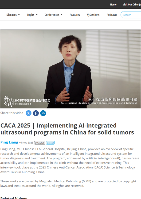 此次VJO推广的专访视频由国内医学媒体ONCO前沿全程采访制作,聚焦获奖项目的核心创新点与临床价值,邀请专家解读研发历程。其中一等奖“肿瘤超声诊疗一体化智能体系”,建立全国最大规范化超声诊疗数据库,将肝肿瘤诊断准确率提升至90%,成果已推广至40余个国家,与VJO“传播前沿医学、推动全球诊疗进步”的理念高度契合。