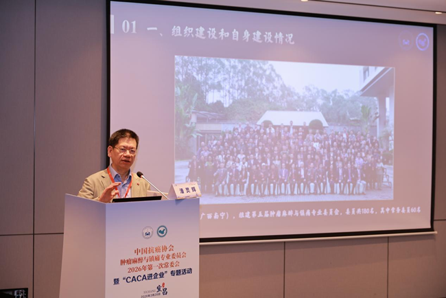 2026年3月28日,中国抗癌协会肿瘤麻醉与镇痛专业委员会在宜昌市成功召开了2026年第一次常委会,为专委会年度工作规划定下基调。会议上中国抗癌协会肿瘤麻醉与镇痛专业委员会主任委员潘灵辉教授作工作汇报,全面总结了2025年专委会在组织建设、学术研究、科普推广等方面取得的显著成绩,并重点部署了面向2026年的核心任务与关键节点。
